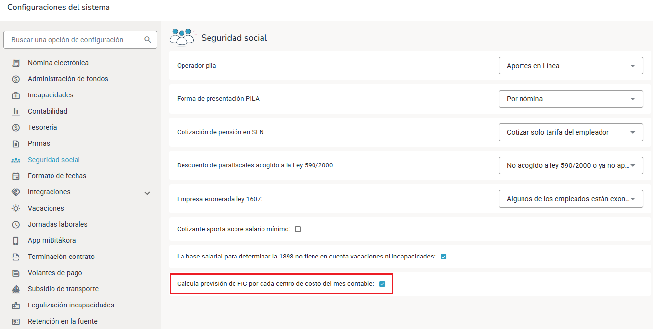 - Verifica la configuración del sistema: ingresa a la sección de Seguridad Social y activa o desactiva la casilla “Calcula provisión de FIC por cada centro de costo del mes contable” según tu necesidad.