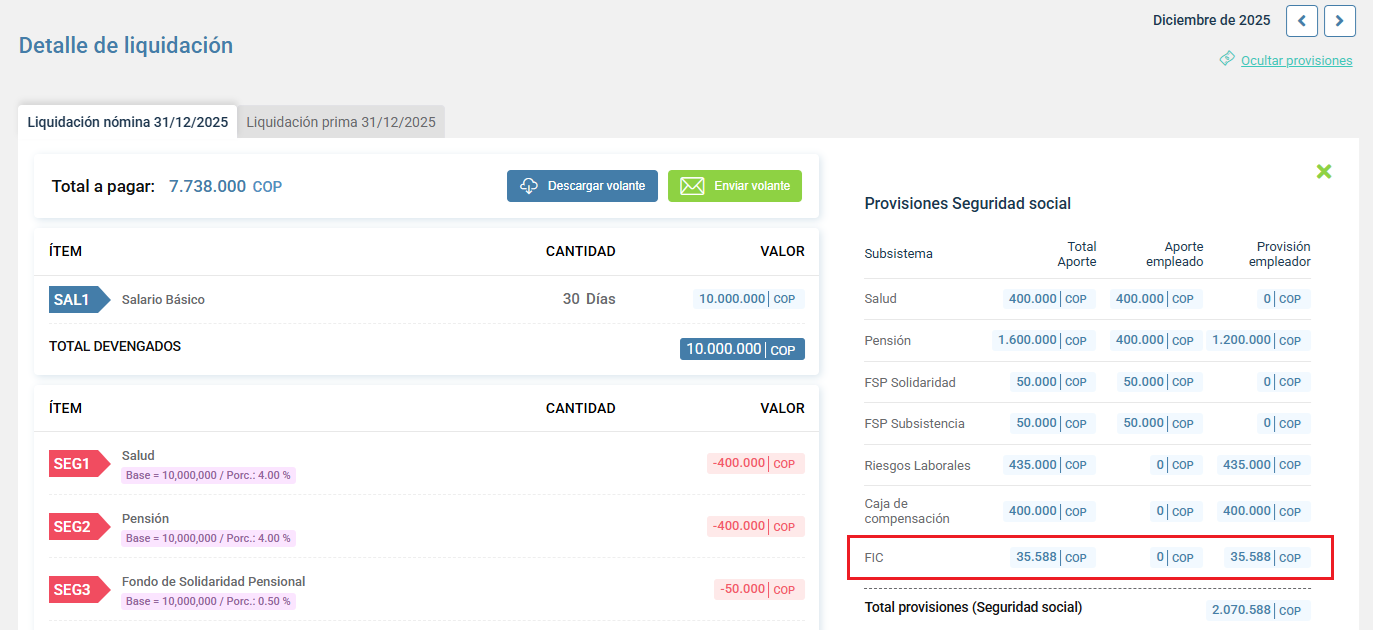 El cálculo del aporte FIC lo puedes observar directamente en la liquidación del empleado.