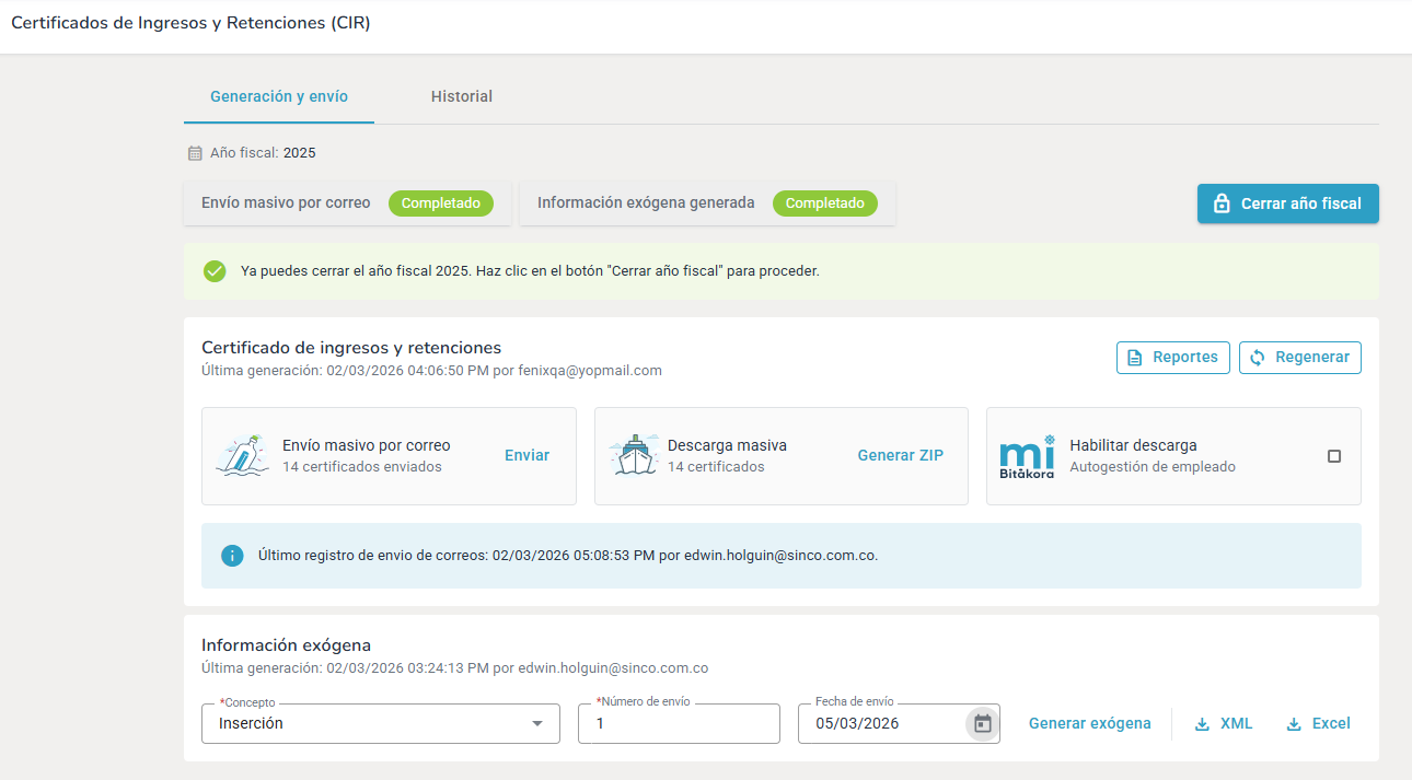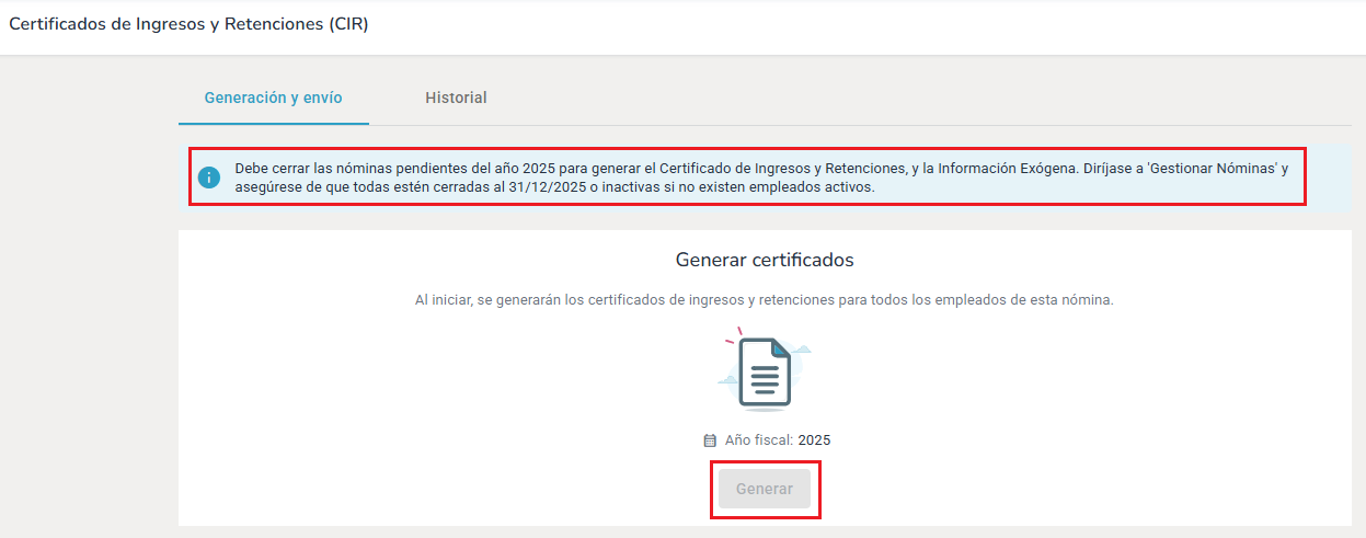 Este aviso aparece cuando los Certificados de Ingresos y Retenciones (CIR) y la información exógena se encuentran en estado Completado.