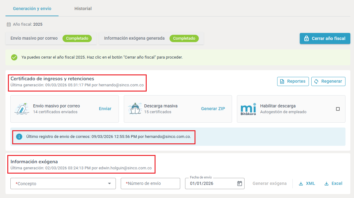 Antes, generación de certificados, exógena y cierre estaban en un mismo bloque con acciones independientes.
