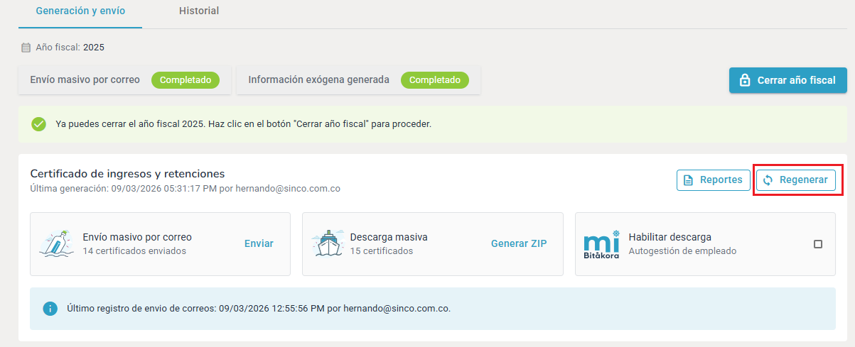 Si modificaste algo en la configuración de los grupos del certificado o de la información exógena, podrás regenerar el proceso. Al hacerlo, se actualizarán los datos del certificado/exógena y los registros de auditoría.
