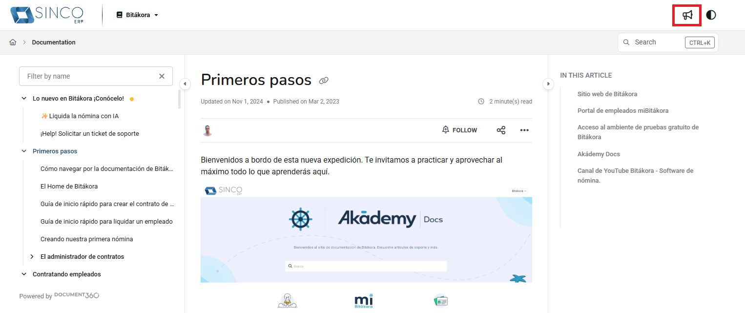 Una vez dentro de la documentación, haz clic en el ícono “¿Qué hay de nuevo?” (recuadro en color rojo) para conocer las últimas actualizaciones.