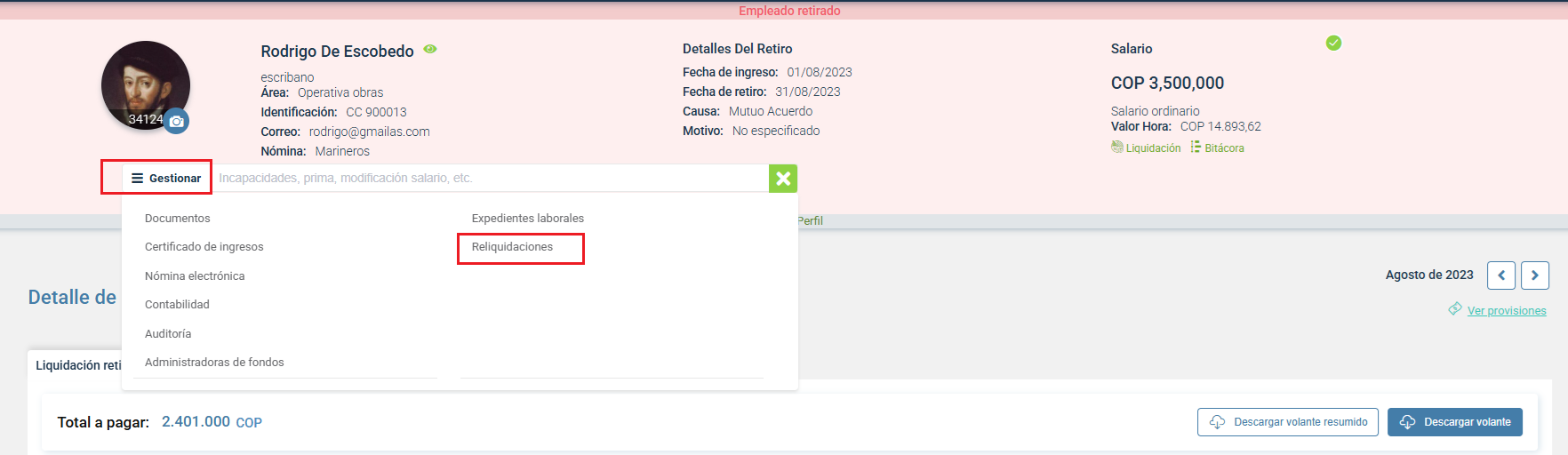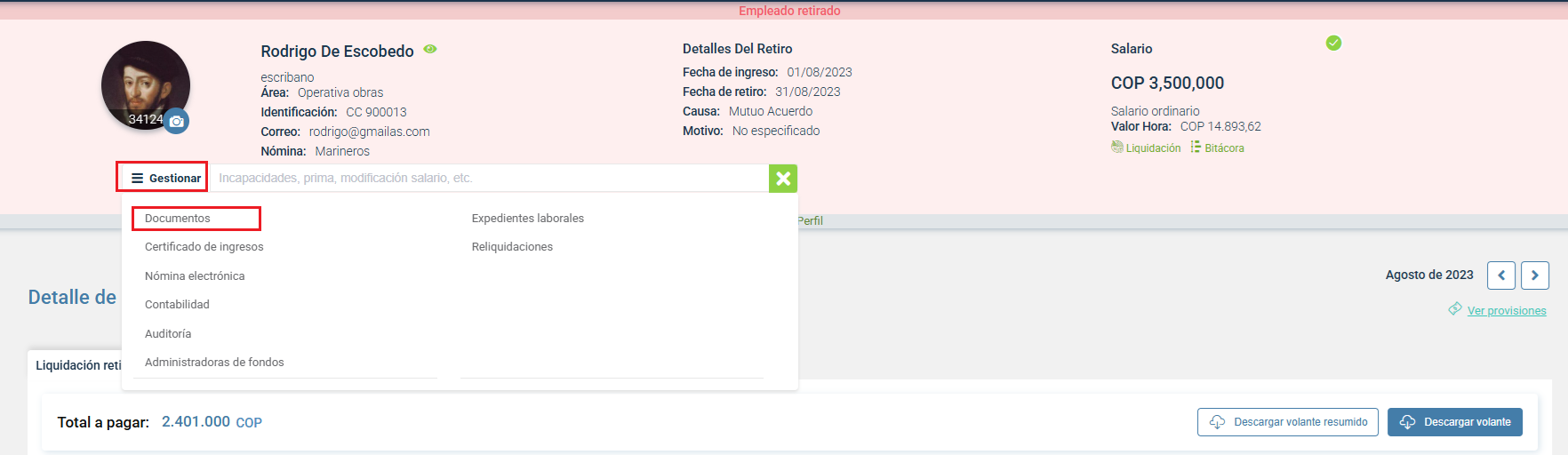 Una vez es creada la plantilla para el documento de reliquidación, se podrá consultar o enviar por correo al empleado, por la opción de Documentos ubicada en el Administrador de empleados.