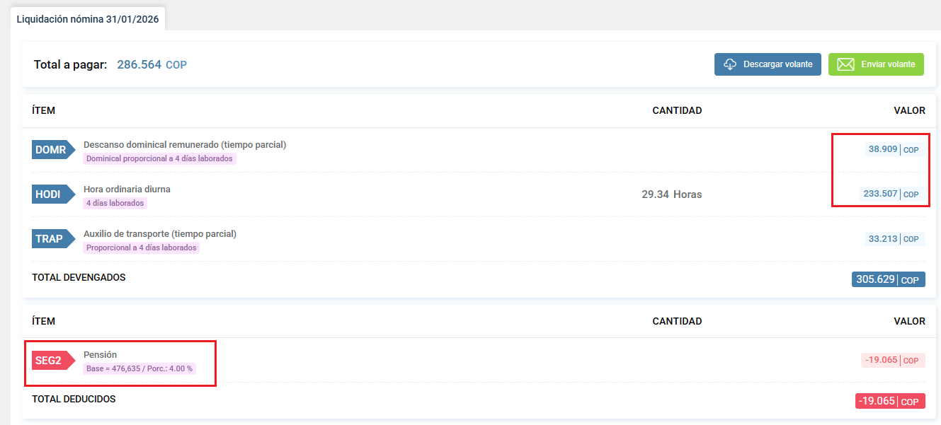 Si observas en la imagen el concepto "SEG2 - Pensión", se muestra la base de $437.726, que es diferente al valor devengado por el empleado en el mes ($272.416), porque el IBC se calculó sobre un SMLMV.