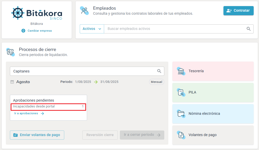 Al ingresar a la opción de cierre de nómina se mostrará las incapacidades ingresadas desde miBitákora y que están pendiente por aprobar.